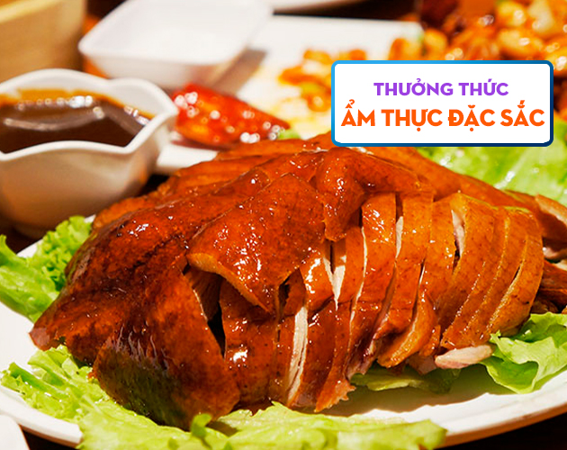 - Đến Bắc Kinh, đoàn dùng bữa tối thưởng thức đặc sản vịt quay Bắc Kinh. Món ăn nổi tiếng với lớp da giòn, cuốn cùng bánh tráng, hành và sốt đậu ngọt.